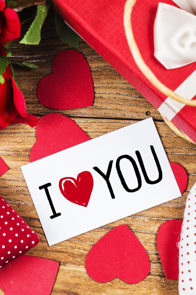 Обои Сердечки, цветы и подарок на столе с запиской