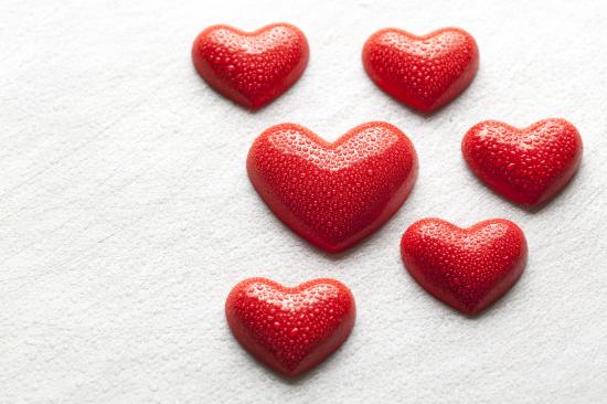 Обои Мокрые красные сердечки на белой поверхности