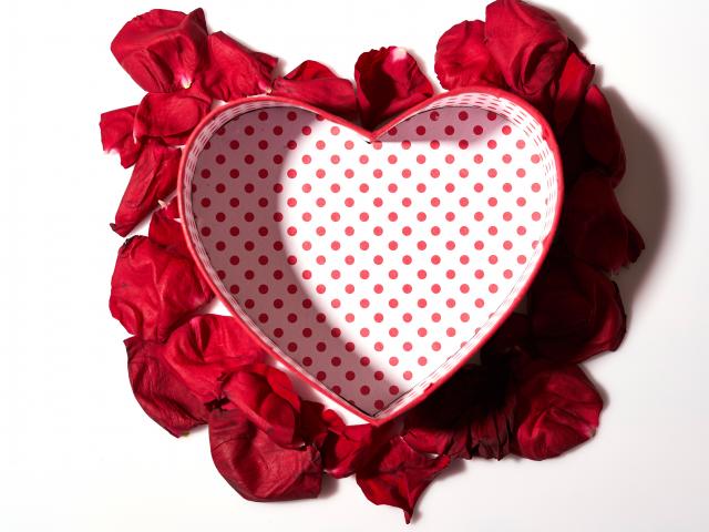 Обои Подарочная коробка в форме сердца с лепестками красной розы на белом фоне