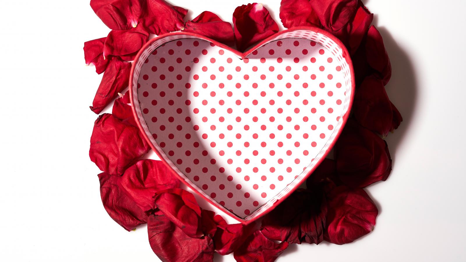 Обои Подарочная коробка в форме сердца с лепестками красной розы на белом фоне