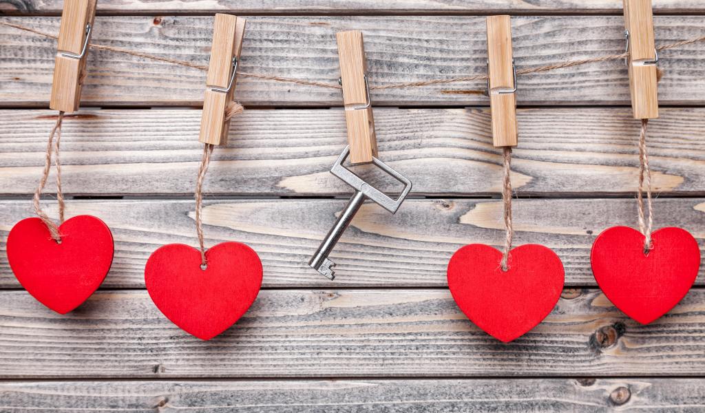 Обои Красные сердечки на нитках на прищепках с ключом