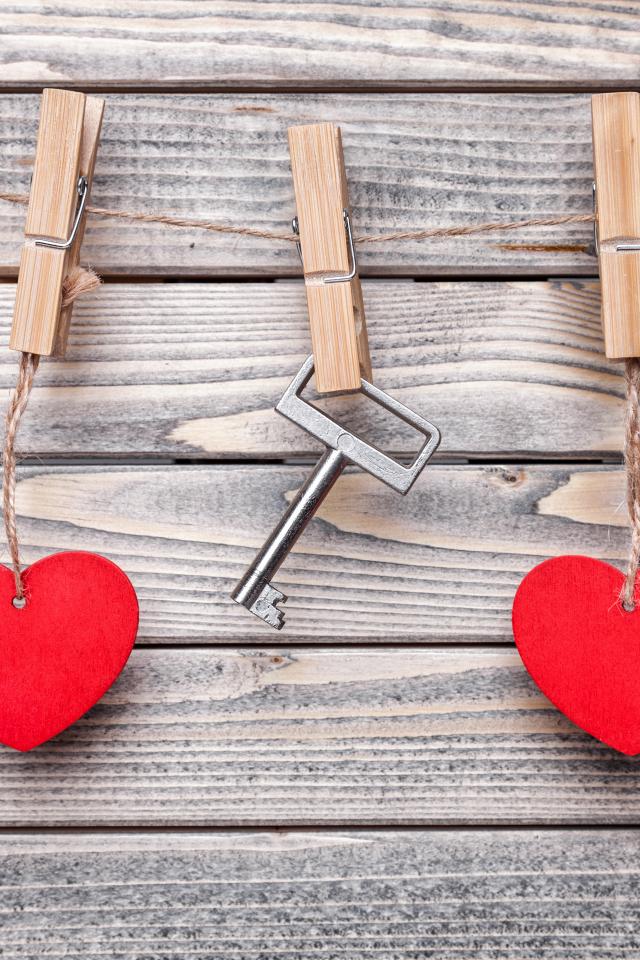 Обои Красные сердечки на нитках на прищепках с ключом