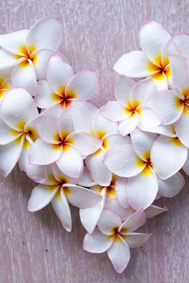 Обои Сердце из белых цветов плюмерии на сером фоне