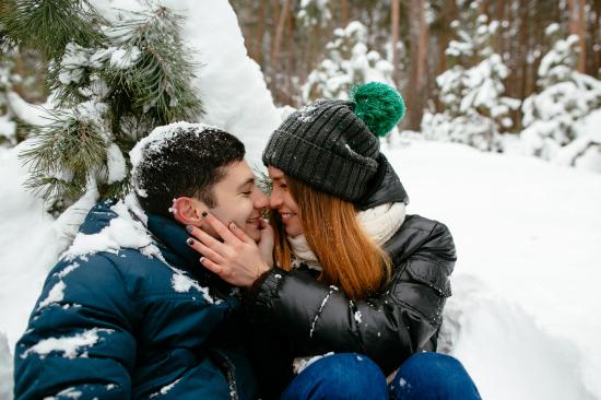 Обои Влюбленная пара сидит под заснеженной еловой веткой зимой