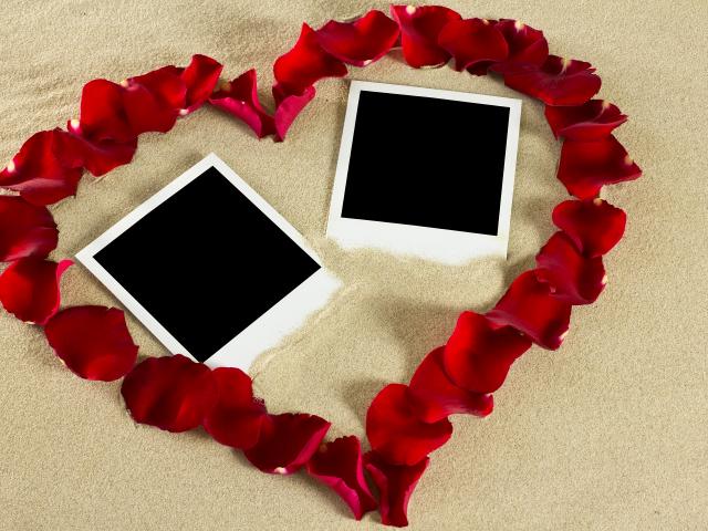 Обои Сердце из лепестков роз на песке с шаблонами для фото