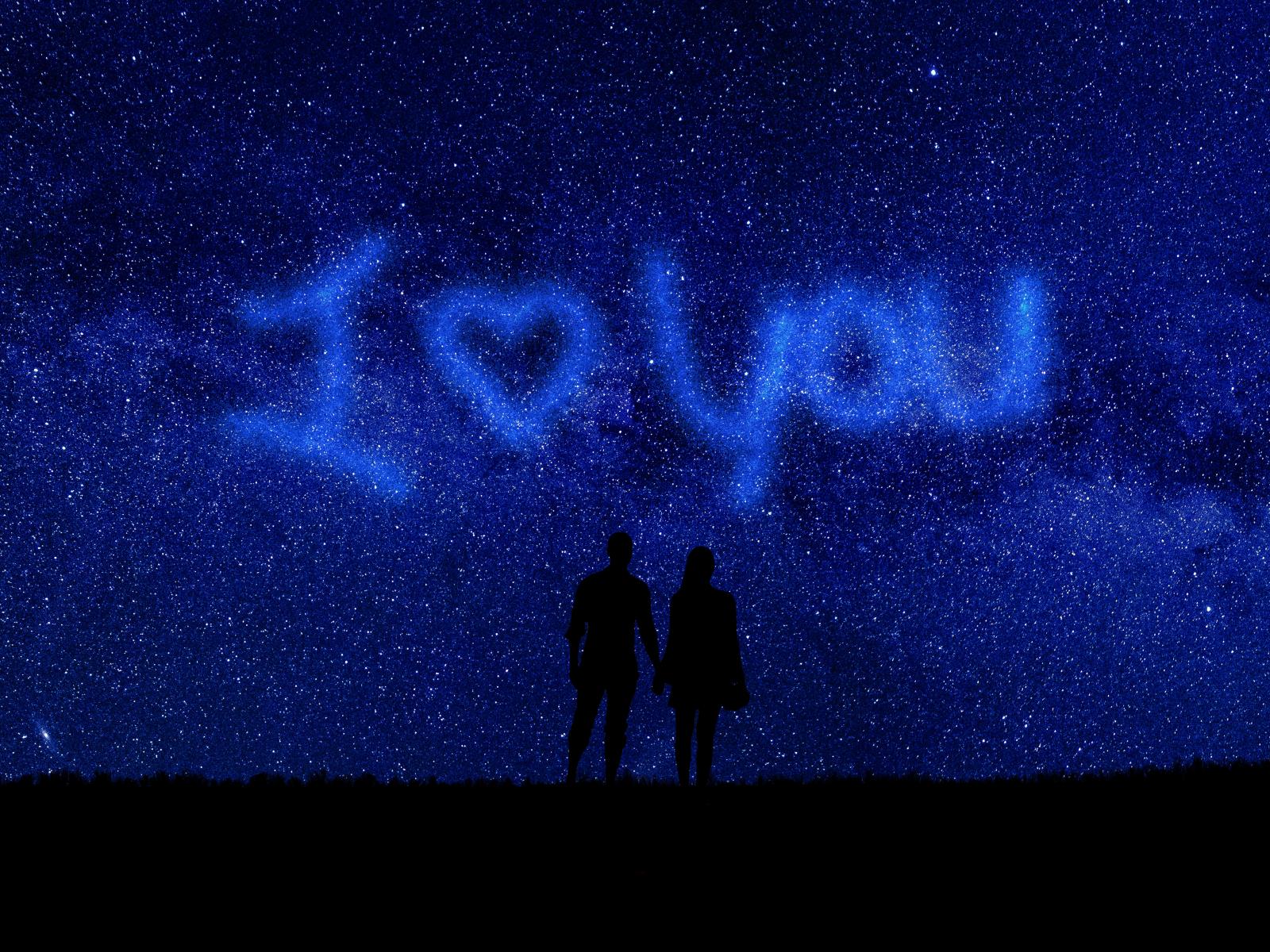 Обои Влюбленная пара на фоне неба с надписью я тебя люблю