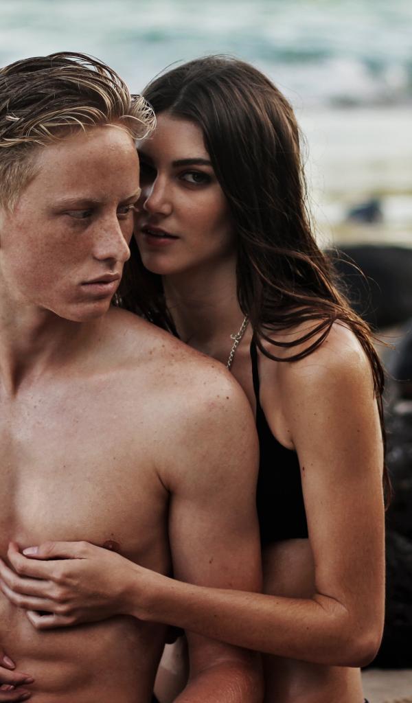 Обои Влюбленная пара сидит на камнях на берегу моря