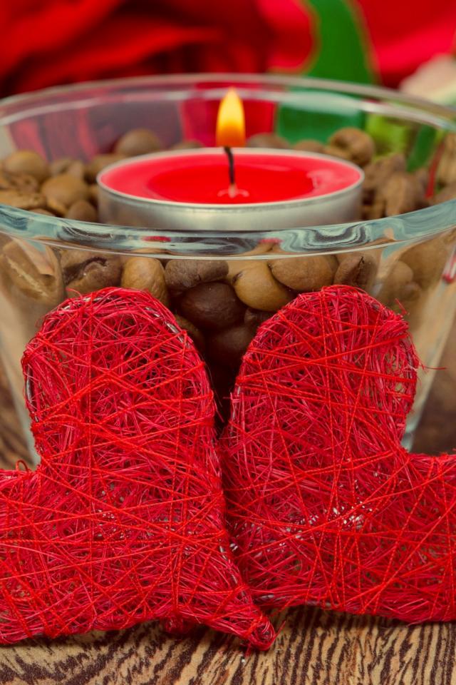 Обои Два красных плетеных сердца на столе с зажженной свечой