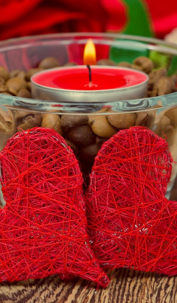 Обои Два красных плетеных сердца на столе с зажженной свечой