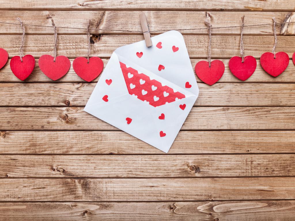 Обои Красные деревянные сердечки на ниткам с конвертом