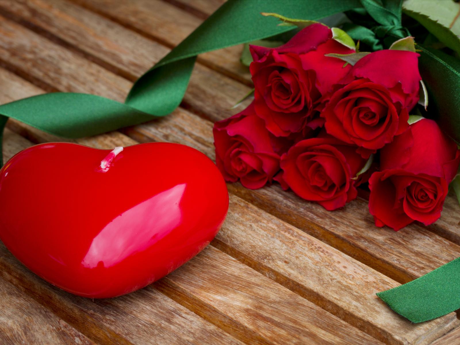 Обои Большое сердце на деревянном столе с букетом красных роз