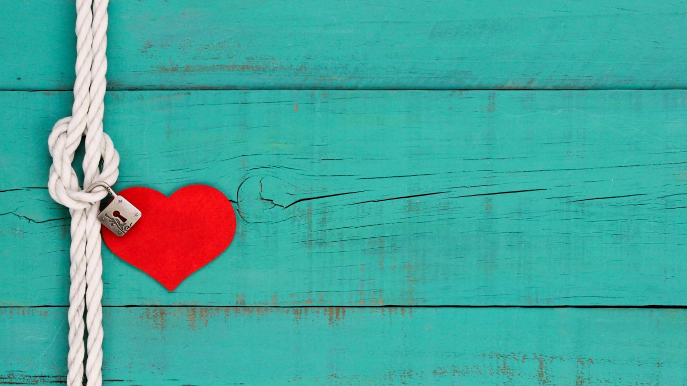Обои Красное сердечко на веревке с замком на голубом фоне
