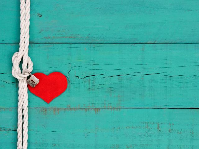 Обои Красное сердечко на веревке с замком на голубом фоне