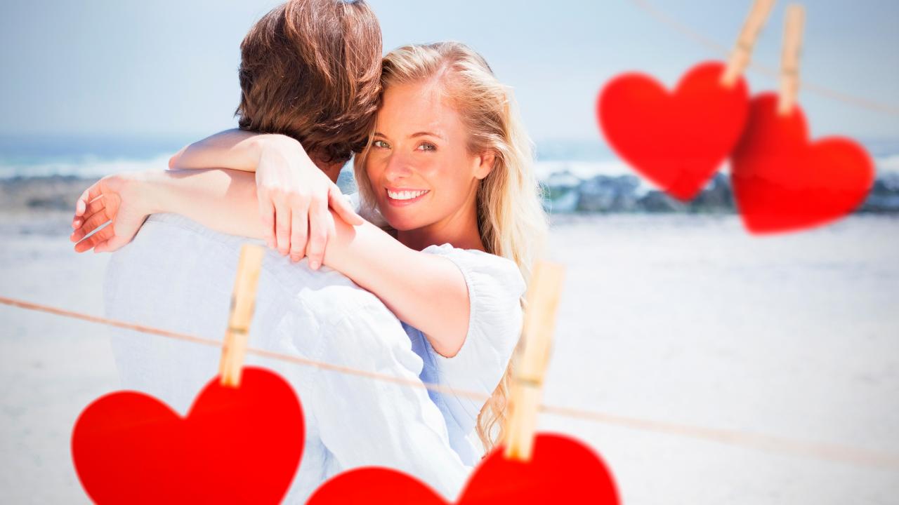 Обои Влюбленная пара на берегу моря с красными сердечками
