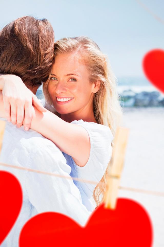Обои Влюбленная пара на берегу моря с красными сердечками