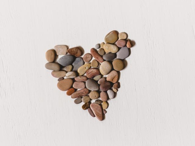 Обои Сердце из камней на песке у спокойного моря под голубым небом