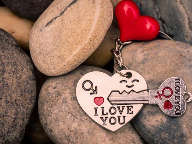 Обои Брелок в форме сердца с ключом лежит на камнях