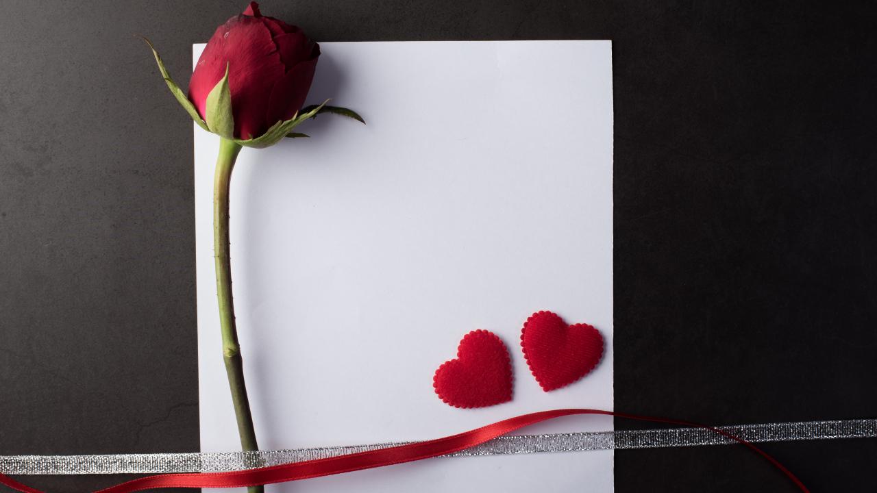 Обои Белый лист бумаги, роза и ленточки на сером фоне