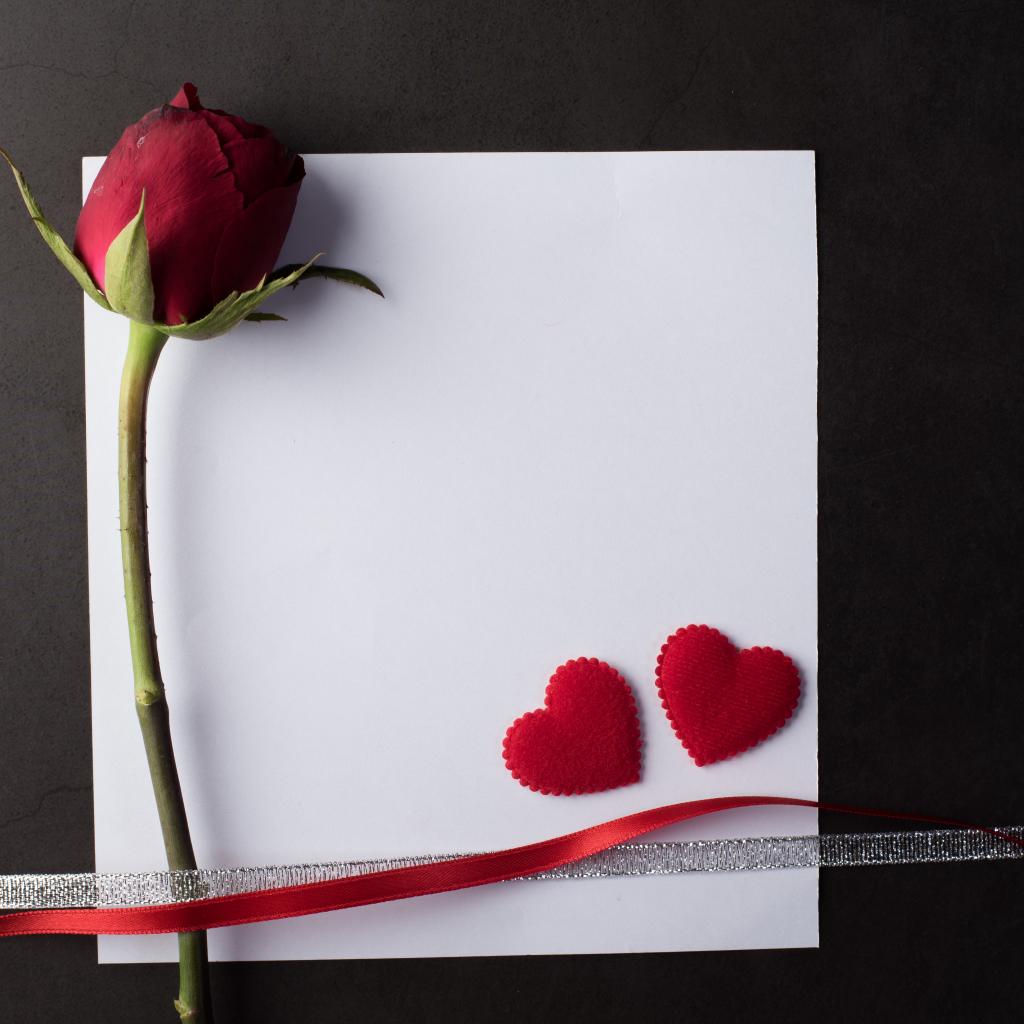 Обои Белый лист бумаги, роза и ленточки на сером фоне