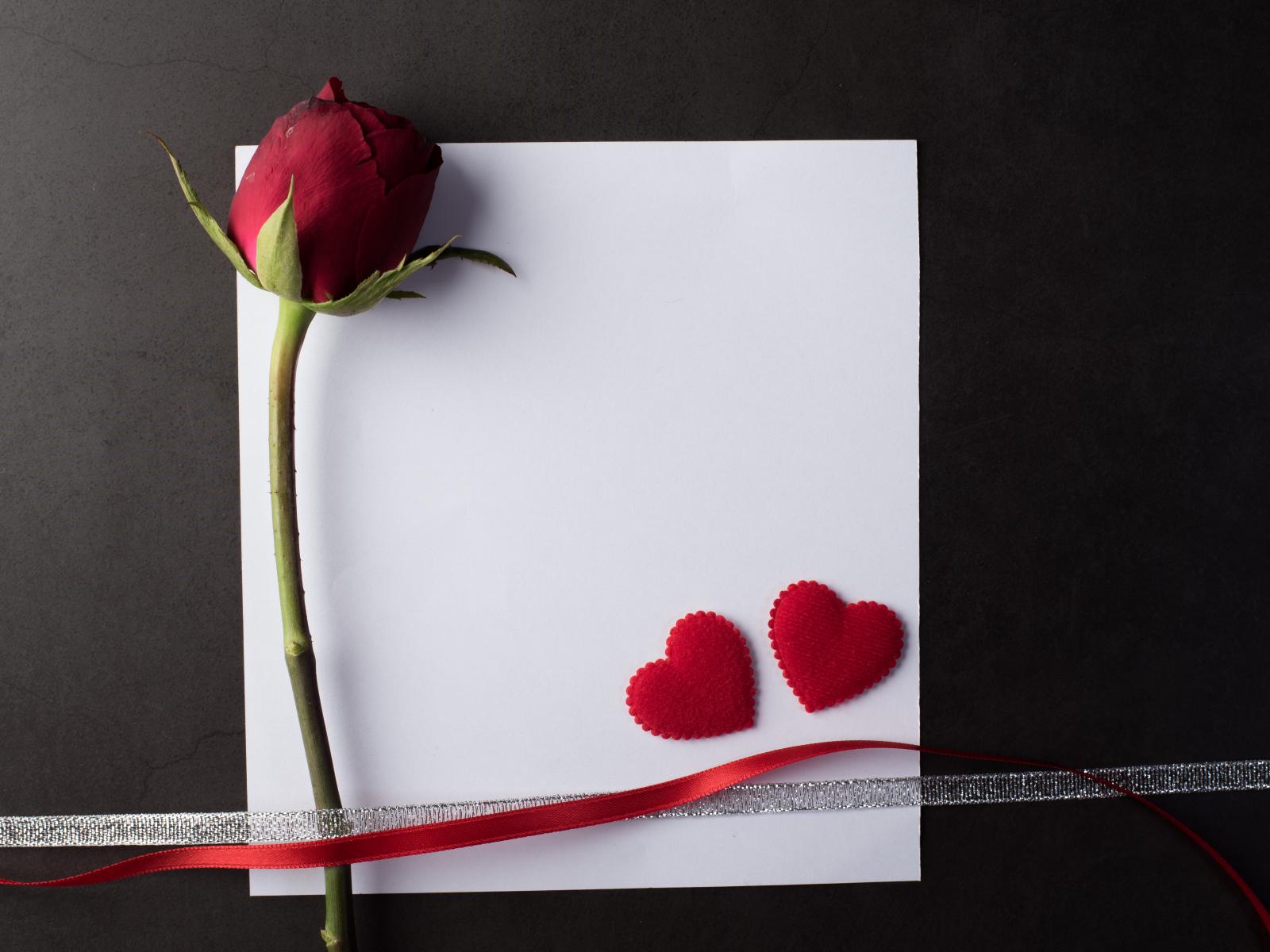 Обои Белый лист бумаги, роза и ленточки на сером фоне