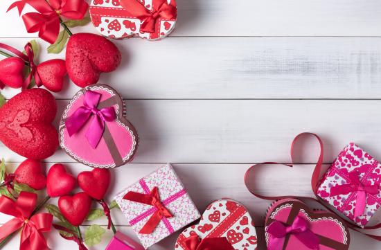 Обои Много подарочных коробок в форме сердца на сером столе