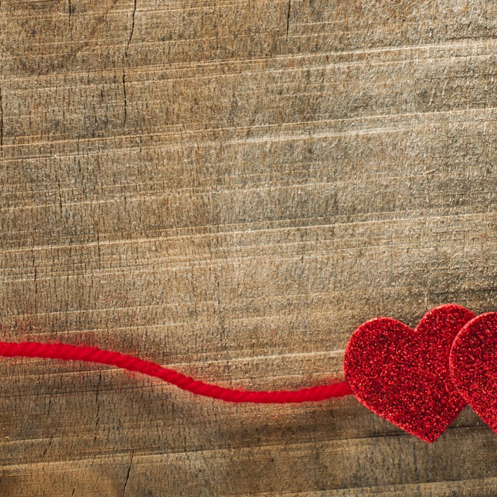 Обои Два красных сердца со шнурком на деревянном фоне