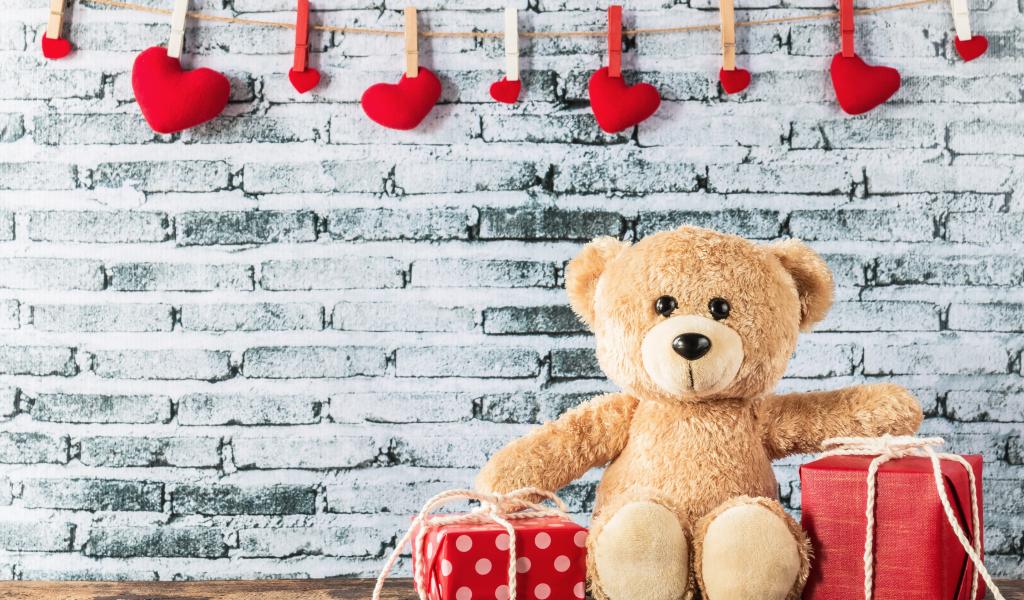 Обои Медвежонок Тедди с подарками на фоне стены с сердечками