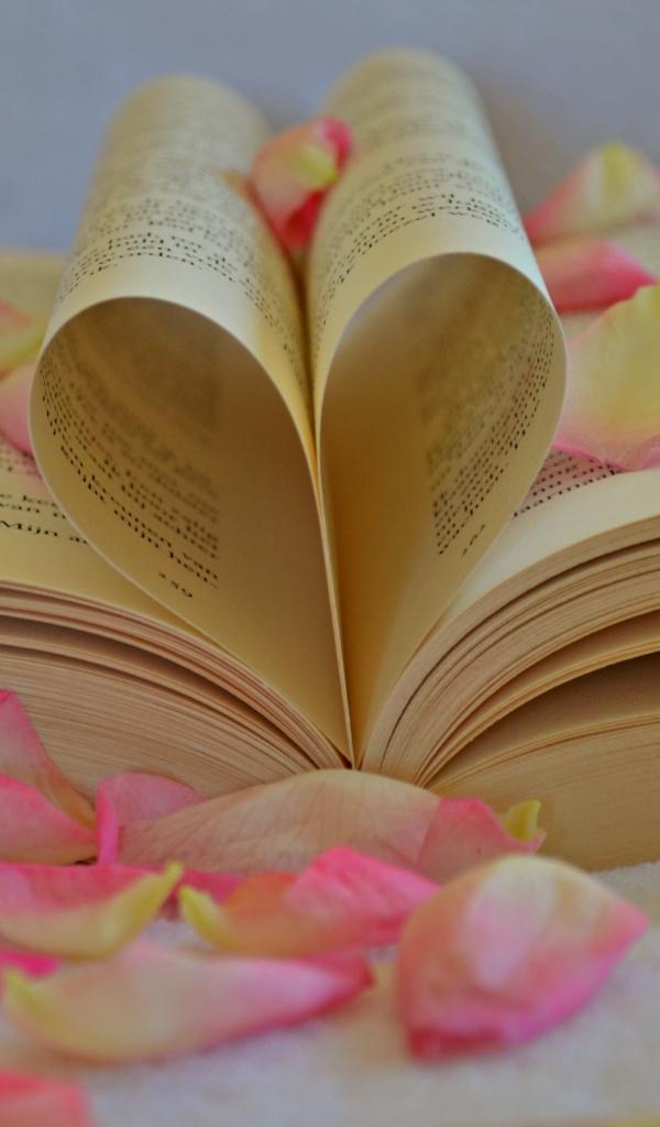 Обои Сердце из листов книги с лепестками розы
