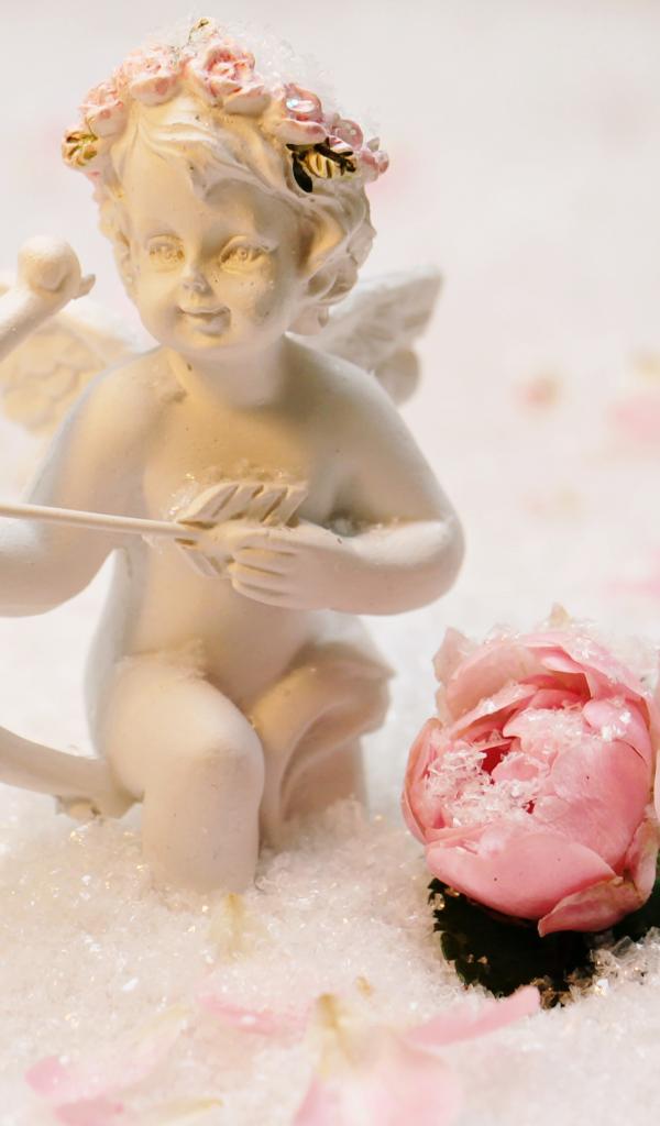 Обои Статуэтка купидона с розой на снегу