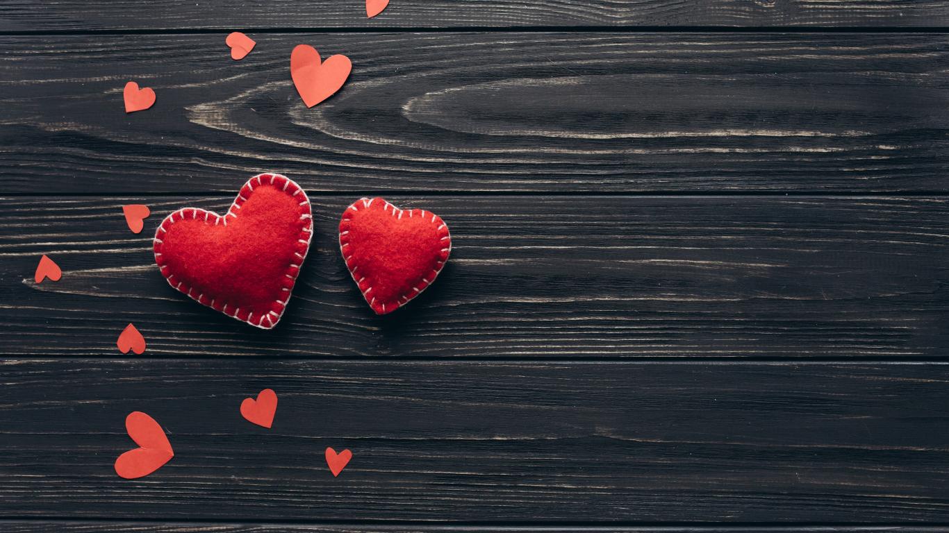Обои Два больших красных сердца с маленькими на деревянном столе