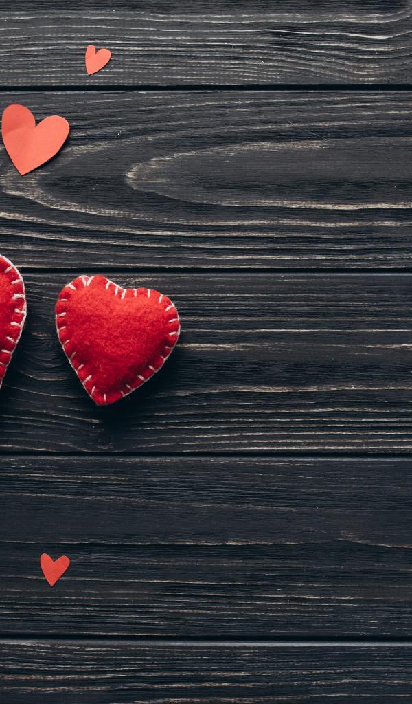 Обои Два больших красных сердца с маленькими на деревянном столе