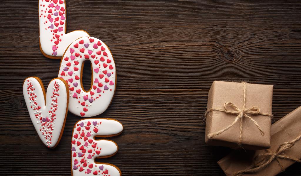 Обои Надпись любовь и подарки для любимой на деревянном фоне