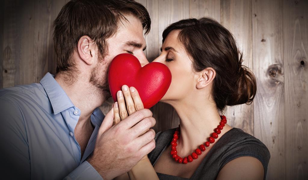 Обои Поцелуй влюбленной пары за красным сердцем