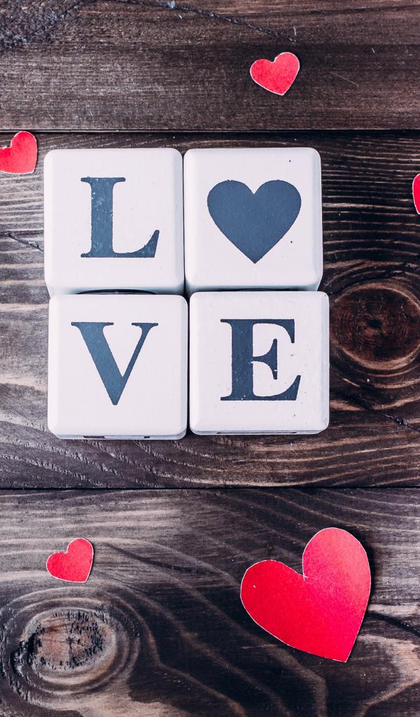 Обои Кубики с надписью любовь с сердечками на деревянном столе
