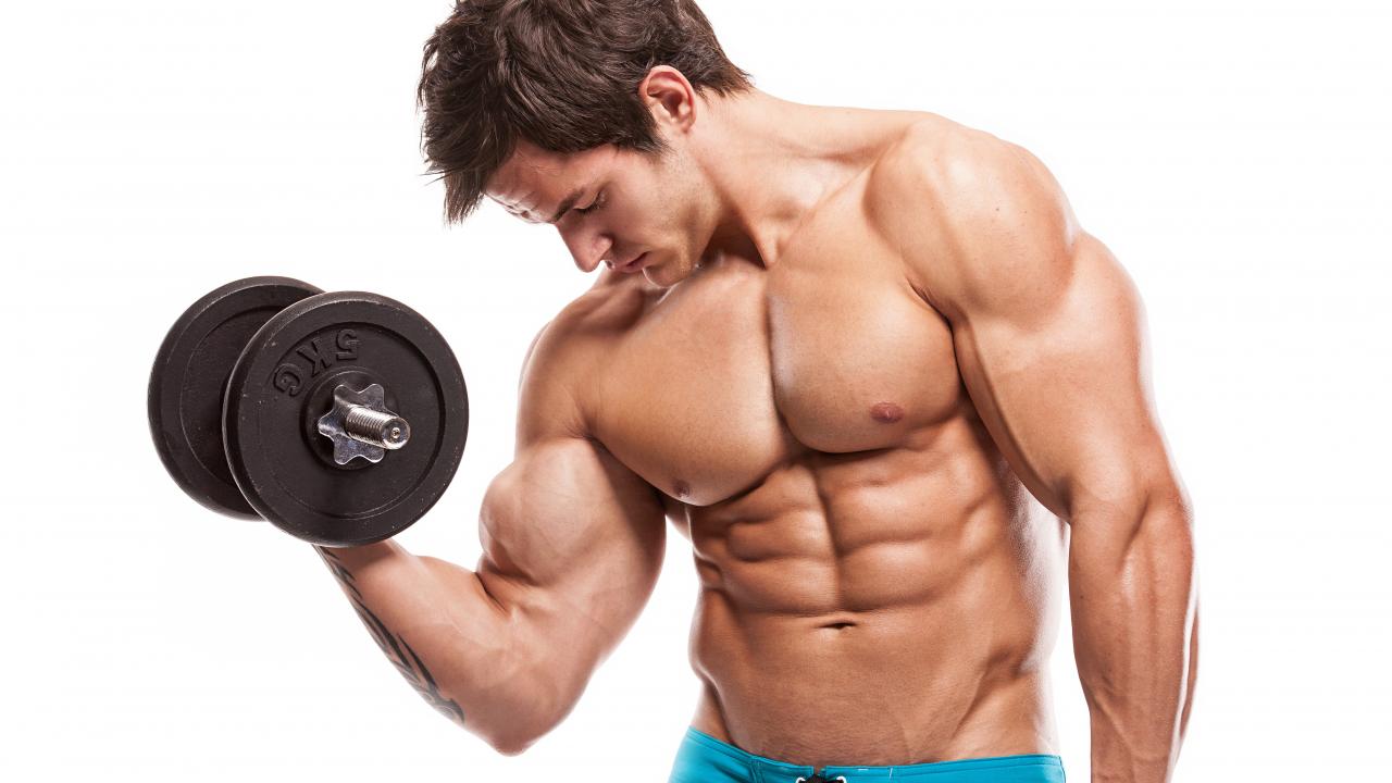 Обои Красивый накаченный парень с гантелями в руках на белом фоне