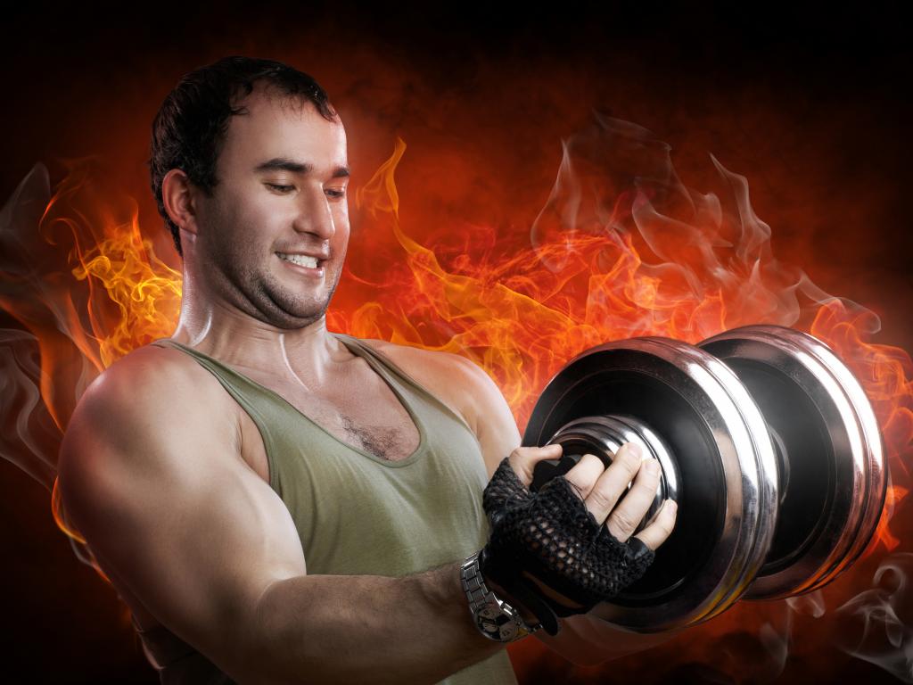 Обои Мужчина спортсмен держит в руках гантелю на фоне огня