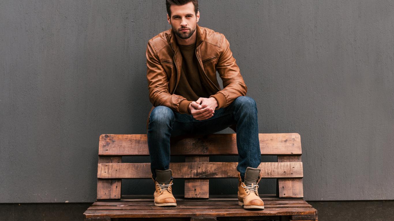 Обои Молодой красивый мужчина сидит на деревянной лавке