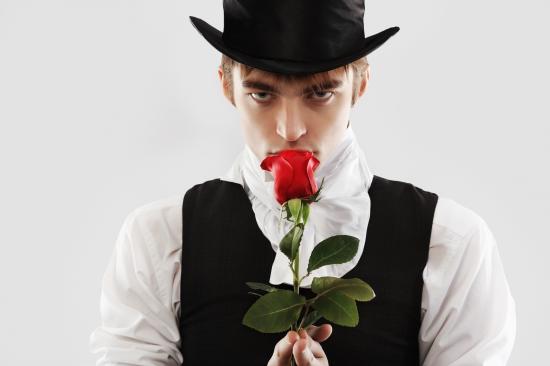 Обои Парень в цилиндре с красной розой в руке на сером фоне
