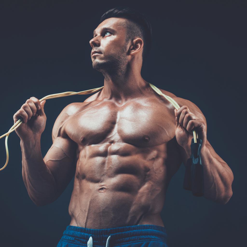 Обои Накаченный мужчина со скакалкой в руках на сером фоне