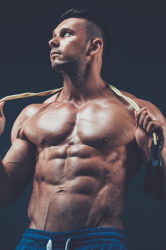Обои Накаченный мужчина со скакалкой в руках на сером фоне