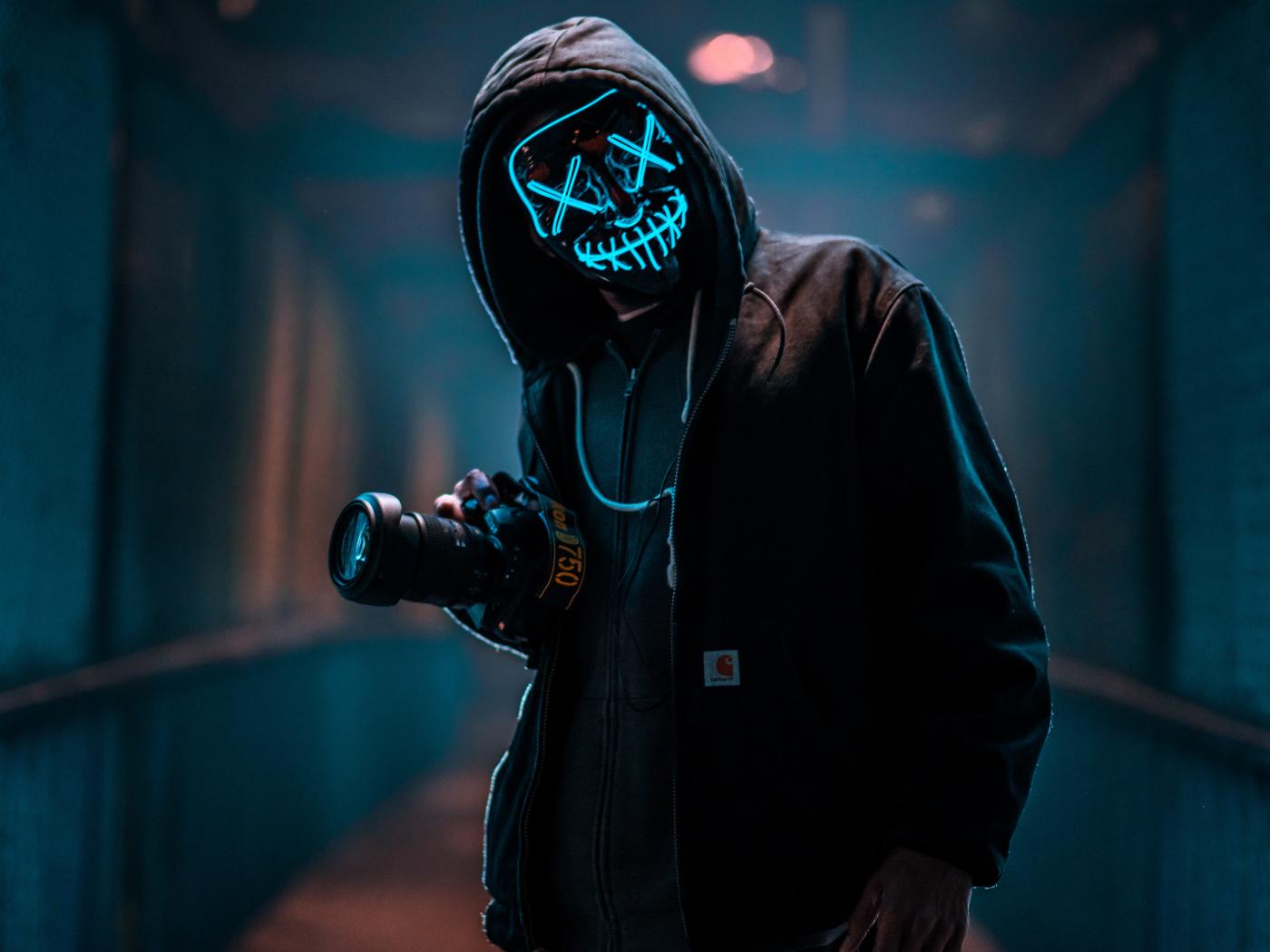 Обои Парень в неоновой маске анонима с фотоаппаратом