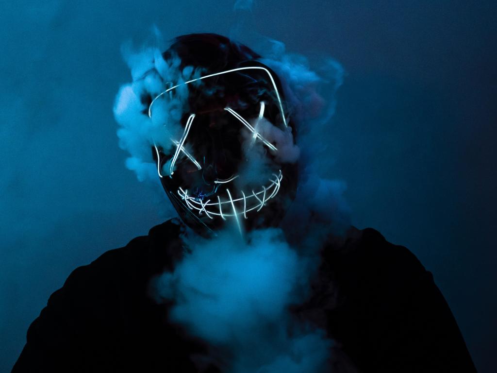 Обои Дым идет из под неоновой маски анонимуса на лице у парня