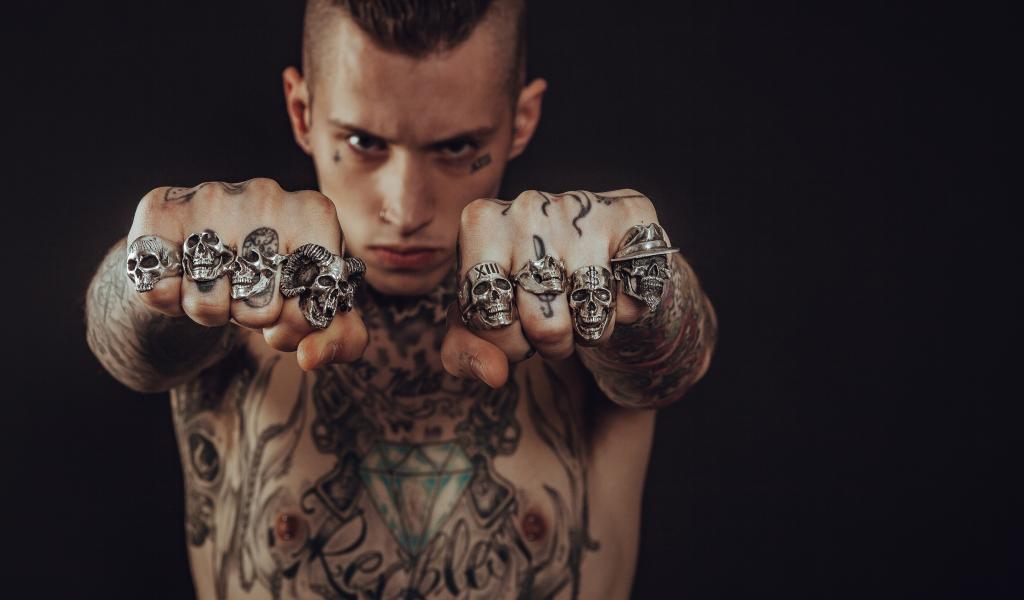 Обои Мужчина с татуировками на теле с перстнями на пальцах