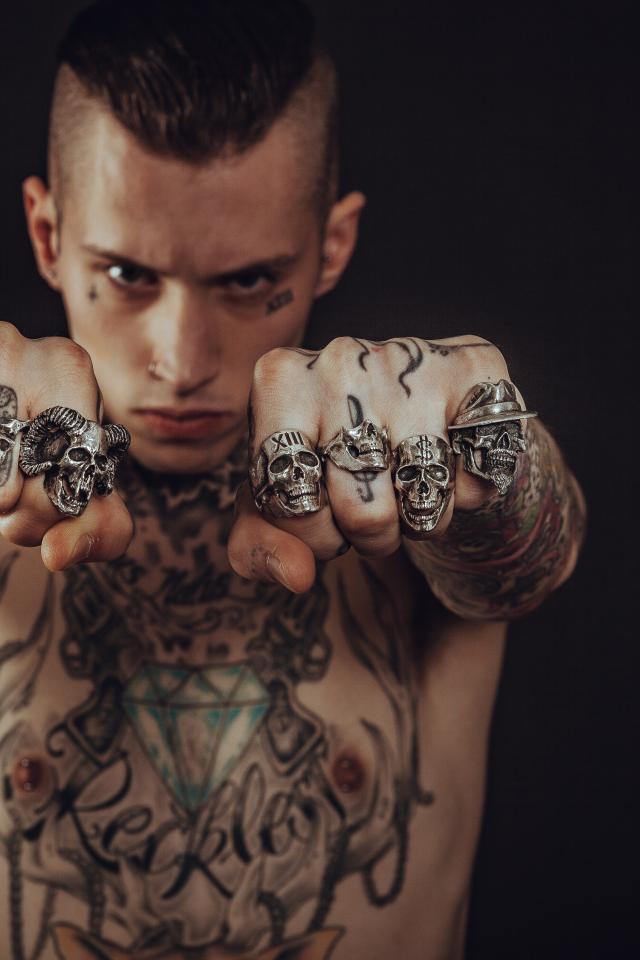 Обои Мужчина с татуировками на теле с перстнями на пальцах