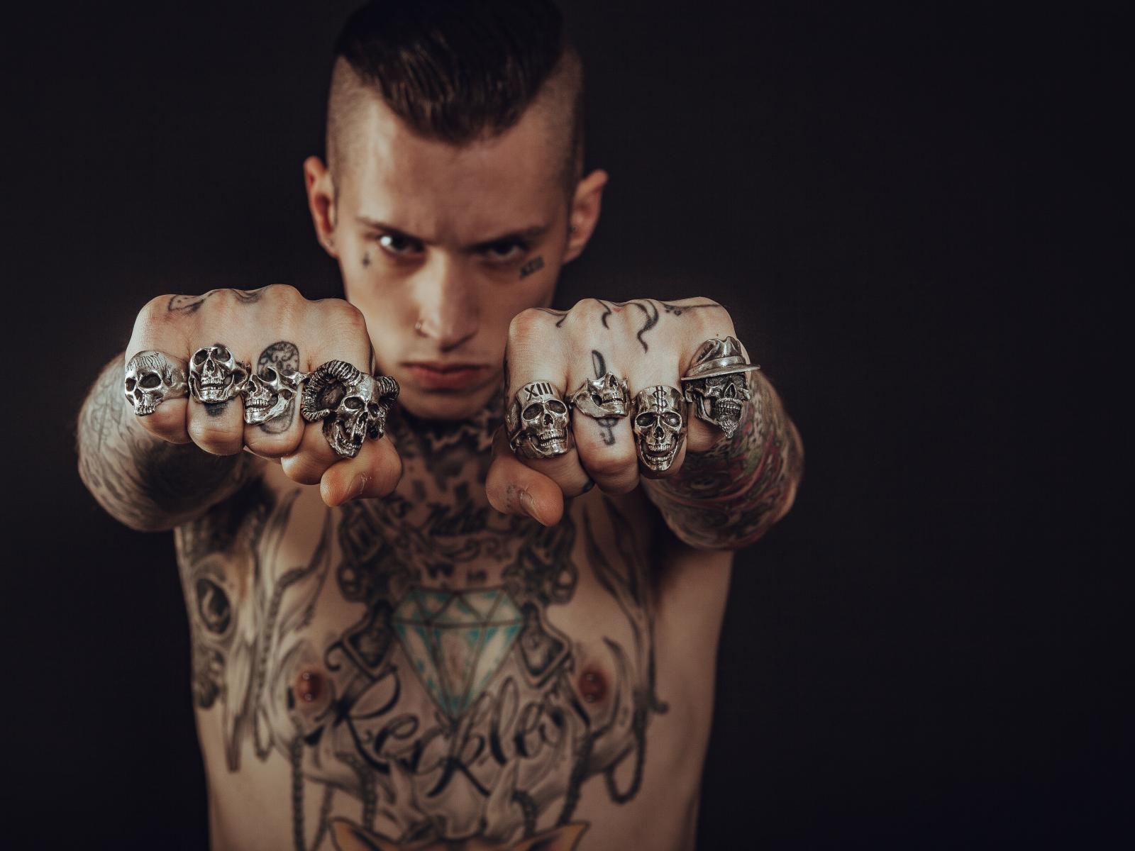 Обои Мужчина с татуировками на теле с перстнями на пальцах