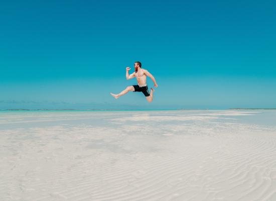 Обои Довольный мужчина прыгает в воде на голубом фоне