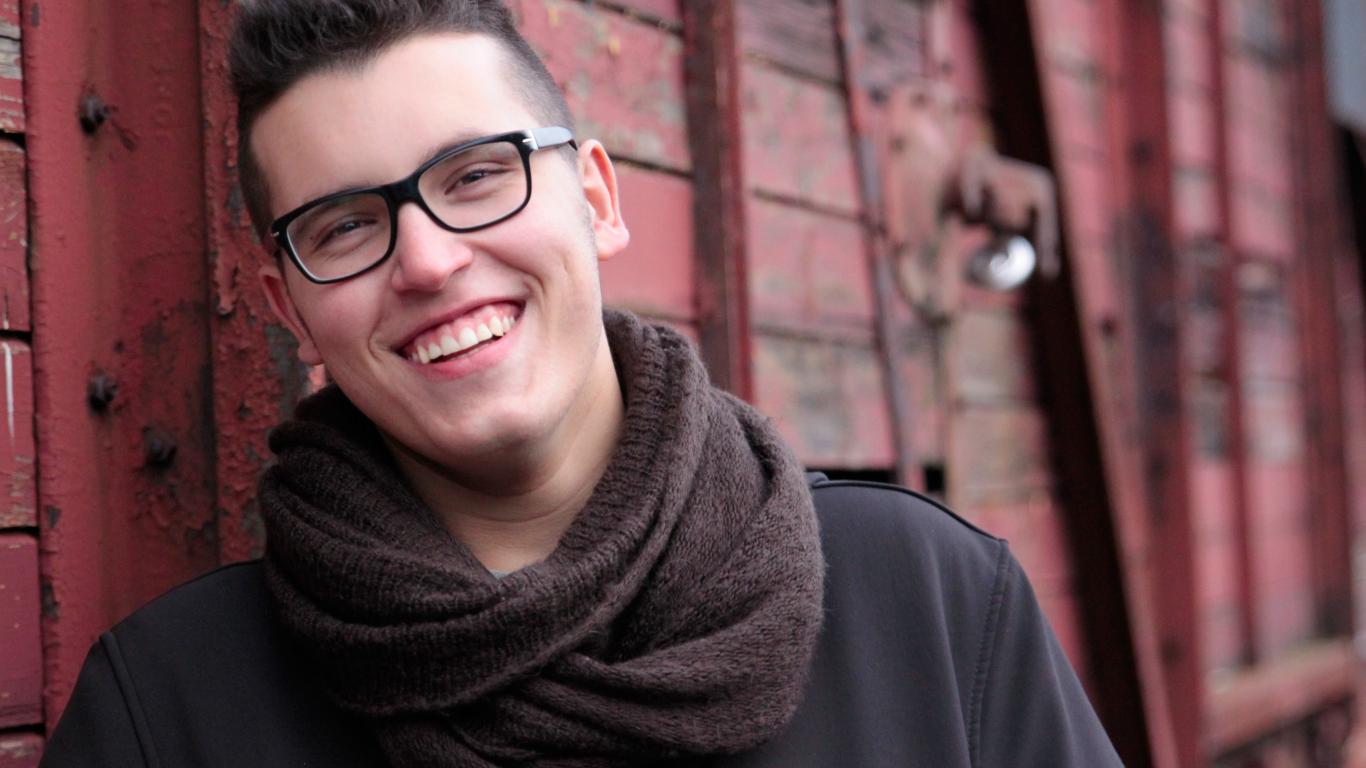 Обои Улыбающийся мужчина в очках у стены