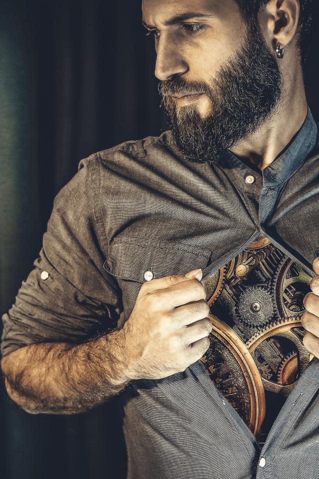 Обои Бородатый мужчина с часовым механизмом внутри