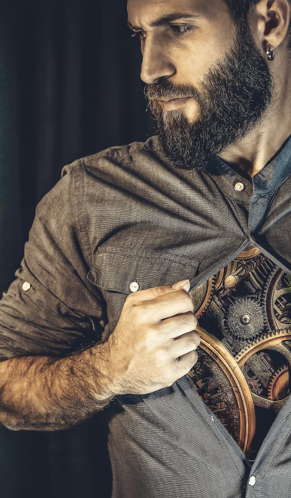 Обои Бородатый мужчина с часовым механизмом внутри