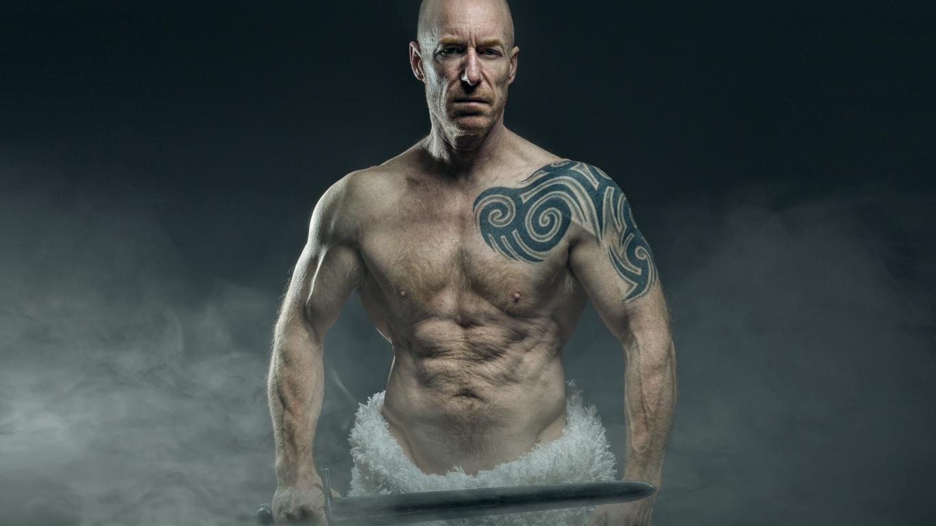 Обои Сильный мужчина с мечом с татуировками на теле